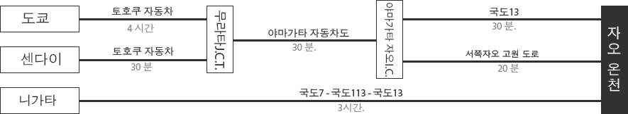 | 야마가타 역 | 자오 온천 버스 터미널 | 자오 온천 버스 터미널 | 야마가타 역 | ||||